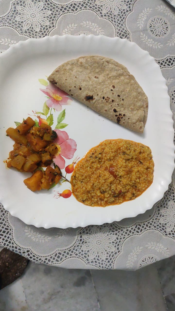 2 roti with bottle gourd curry, yellow lentil and Bundi raita
